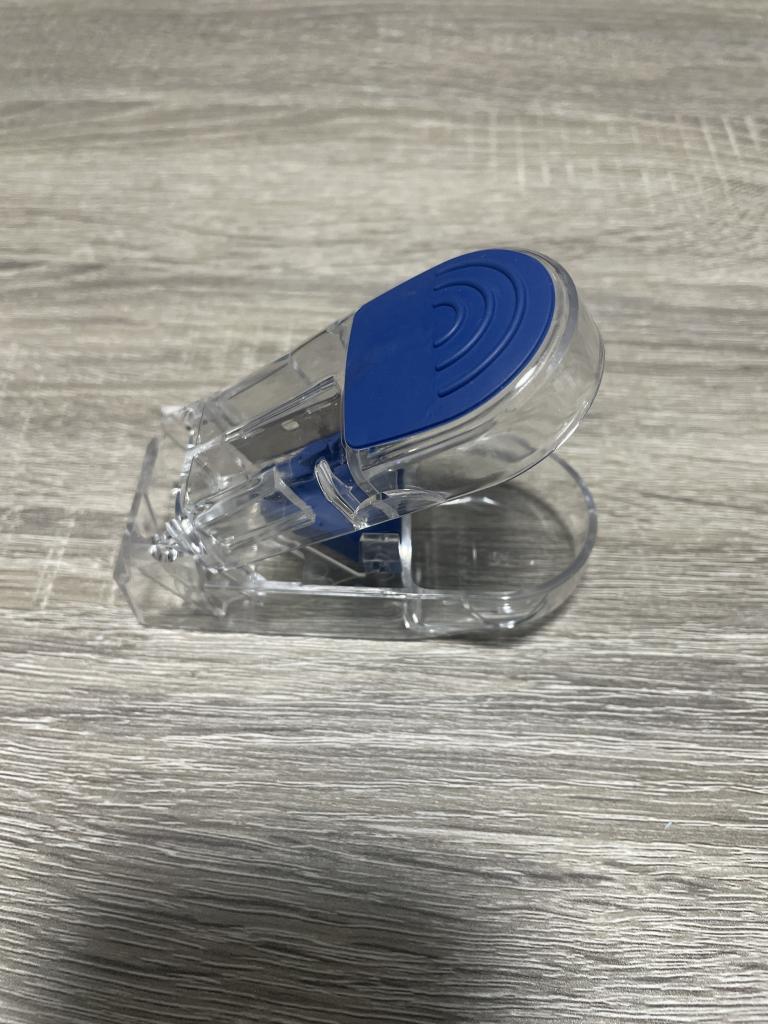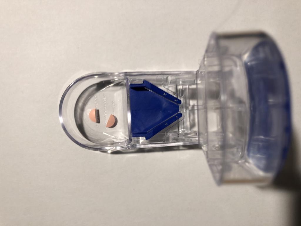 写真は、切断後に容器のふたを90度に開けて、上から撮ったものです。よく見ると、2つに割れたオレンジ色のエスゾピックが、青い三角の錠剤置きの皿の先に転がっているのが分かると思います。