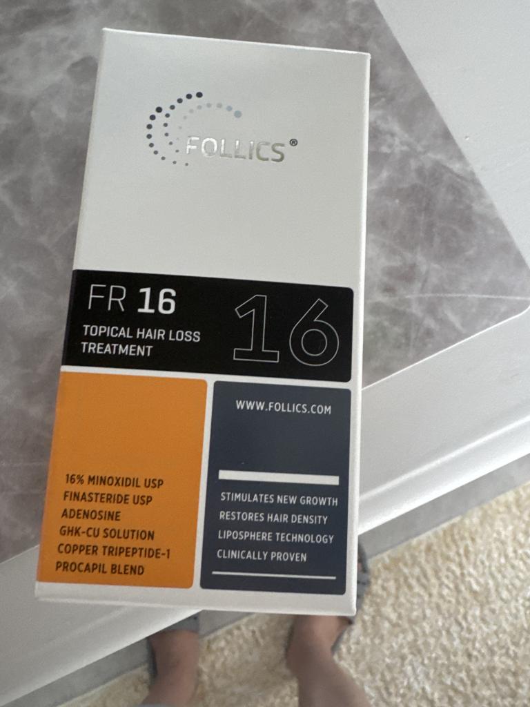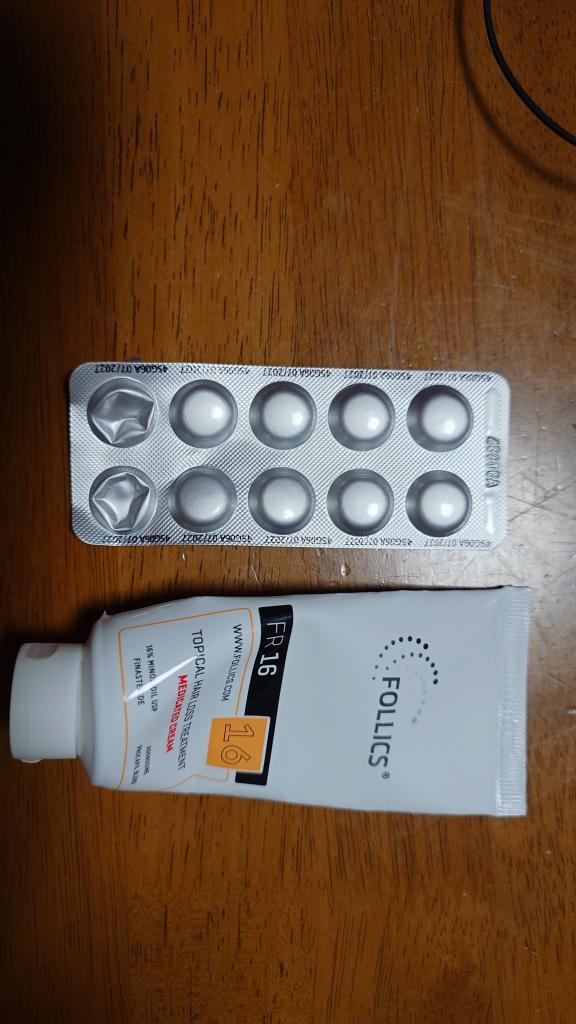 お正月セールで購入しました。FR16クリーム、ミノタブ10mg、フィナロイド1mgを2年ほど使っています。クリームの塗布だけではあまり効果が実感できませんが、錠剤を内服することで明らかに変化が見られます。M字部分に徐々に産毛が生え、今はある程度しっかりした毛に成長しています。全体的に髪にコシが出てきた気がしています。