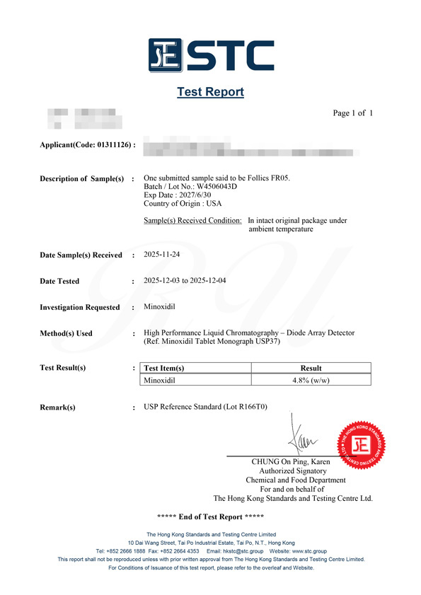 ▼Follics(フォリックス)FR05は、最先端の有効成分ミノキシジルを5%含有