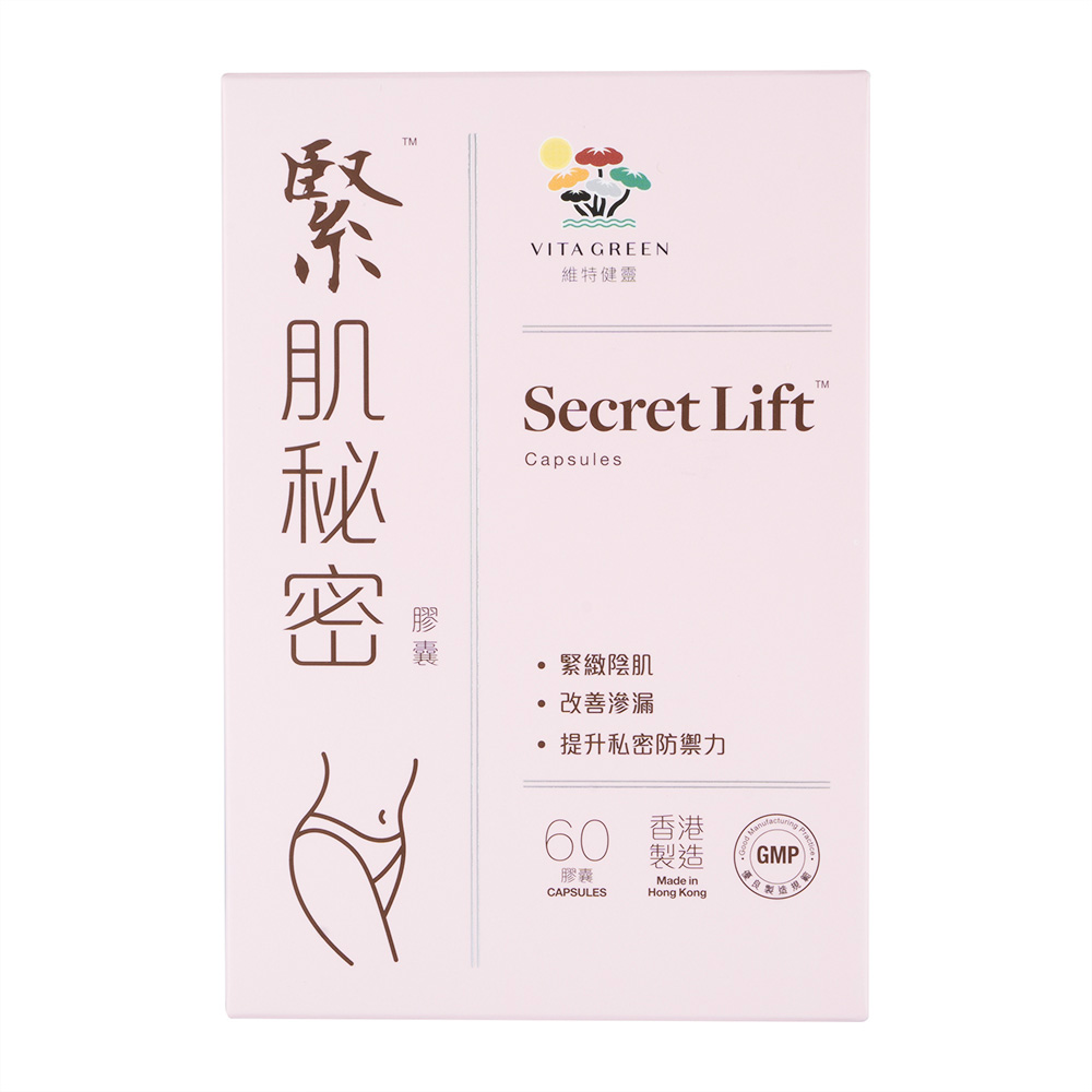 VITA GREEN(バイタグリーン)のシークレットリフト(緊肌秘密)は、多くの種類の漢方成分とビタミンDを配合した女性向けサプリメントです。骨盤底筋をサポートし、膣のゆるみによる尿漏れやデリケートゾーンの健康キープにアプローチします。
