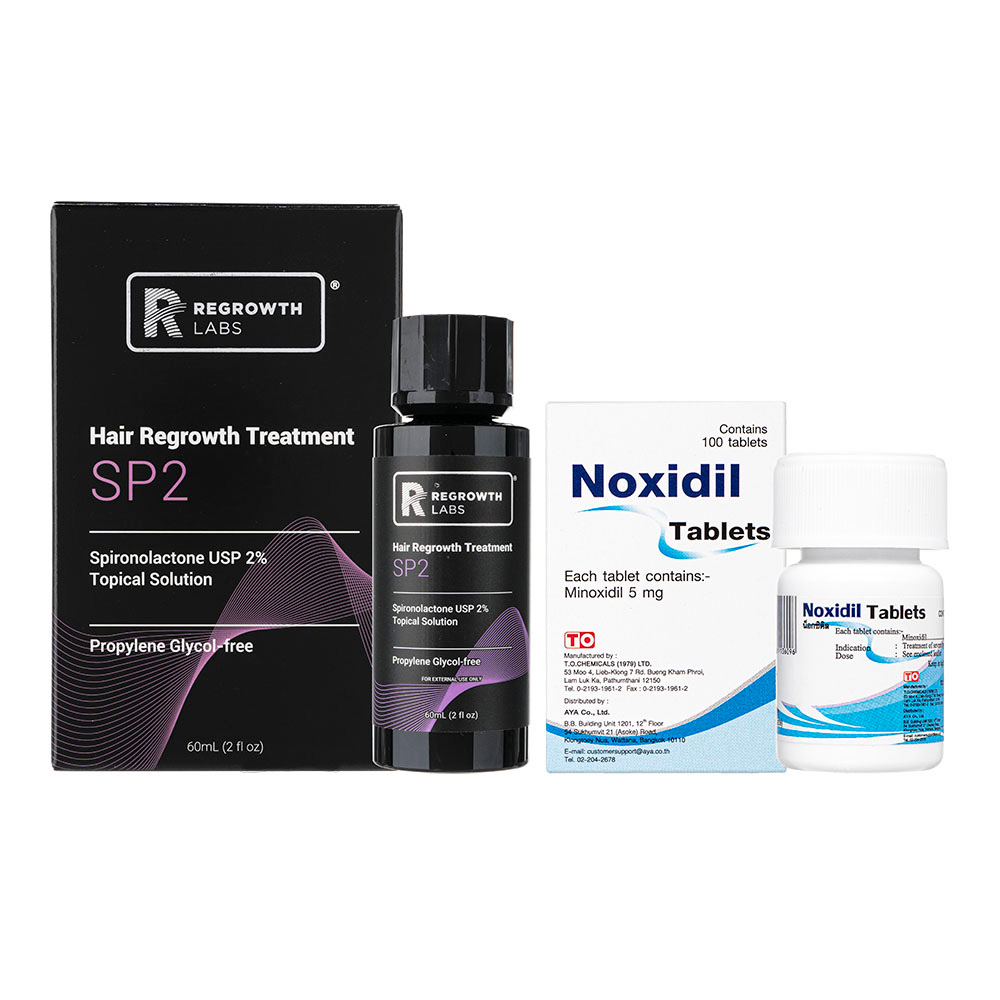 SP2はスピロノラクトン2%を含有した外用育毛剤で、ノキシジルタブレットはミノキシジルを有効成分とする経口薬です。内と外から髪に働きかけ成長を後押しします。