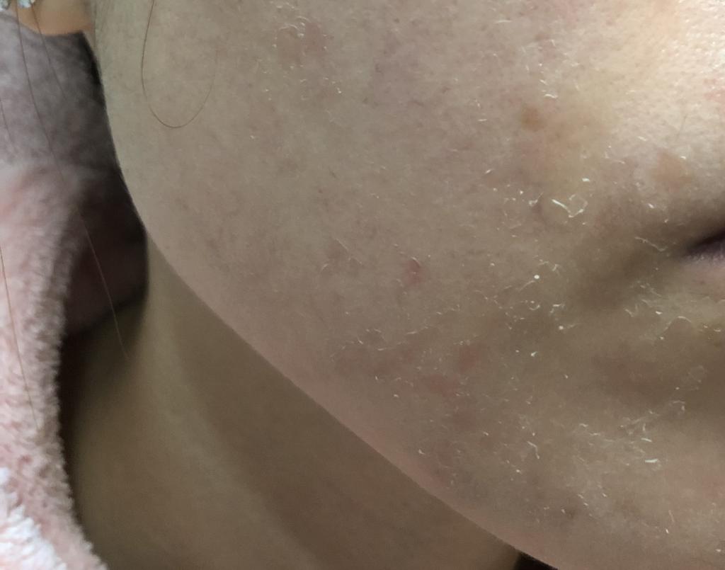 顔全体に薄く使用しむけはじめは1週間ほどたってからでした。かゆくも赤くもならず緩やかに少しづつ剥けている感じです。