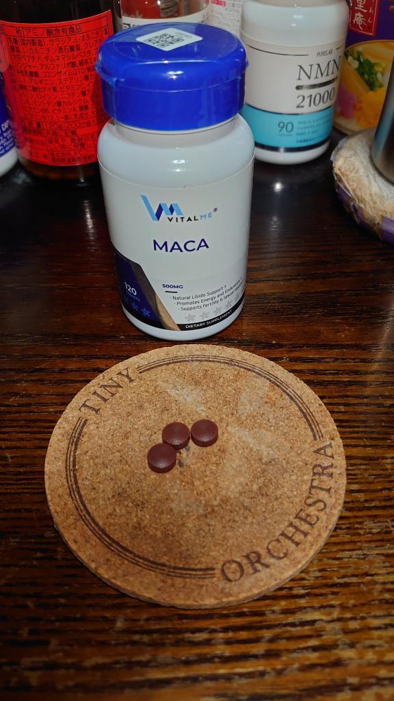 マカは、ビタミンEや植物性エストロゲンが含まれており、女性ホルモンのバランスを整える効果が期待できることで、以前は日本メーカーのサプリを飲んだことがありますが、バイタルミーさんは今回初めてです。成分量の濃度は、日本メーカーのものに比べると決して高くないのですが、私は1日2回、朝晩1錠を飲んでいて、なんとなく、元気が出て気分が落ち着くことができました。しばらく1日2錠を飲み続けてみようと思います。タブレットが大豆ほど小さいので、飲みやすいです。