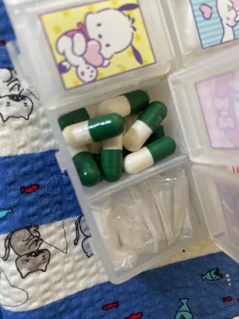 半分はオブラートに包んでピルケースに並べてストック。もう半分はカプセルを戻しておきますが、カプセルの色が気になるのでこちらも飲む時はオブラートに入れて飲んでいます。
