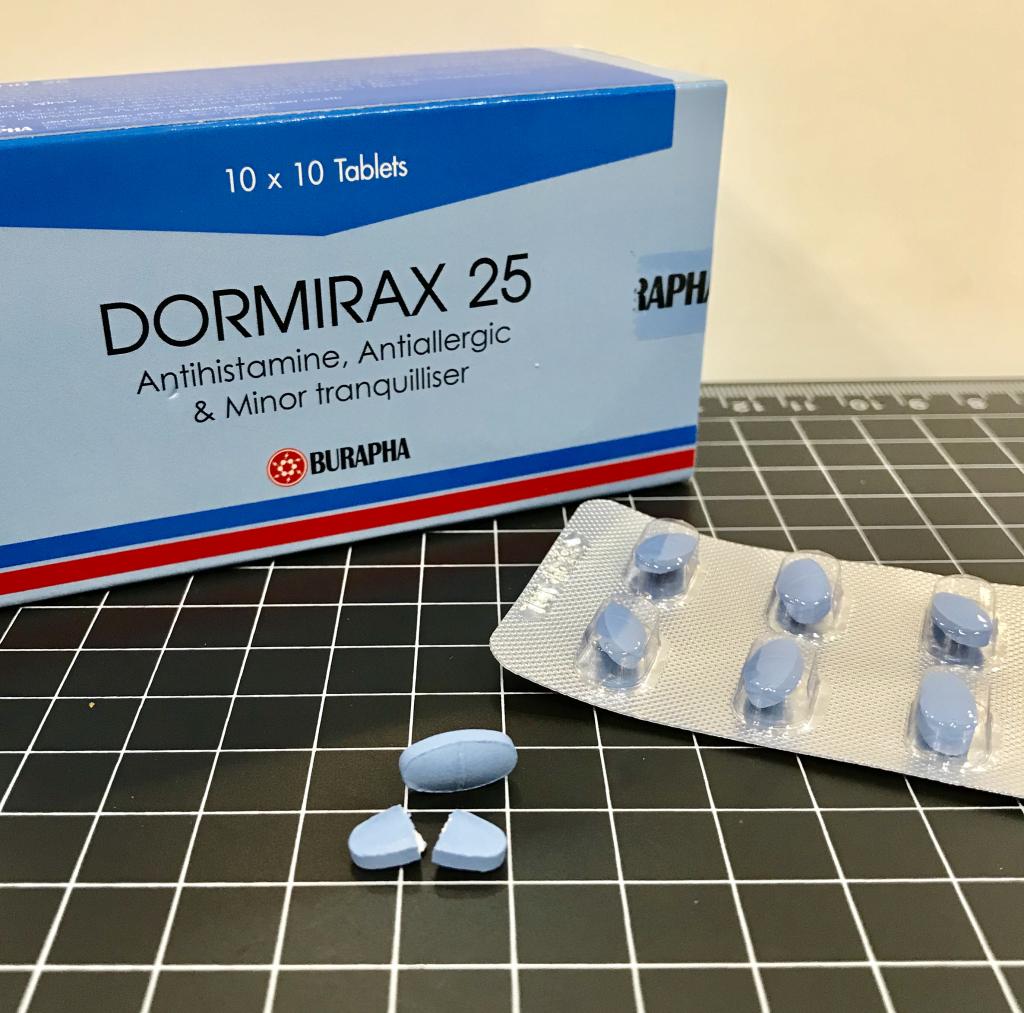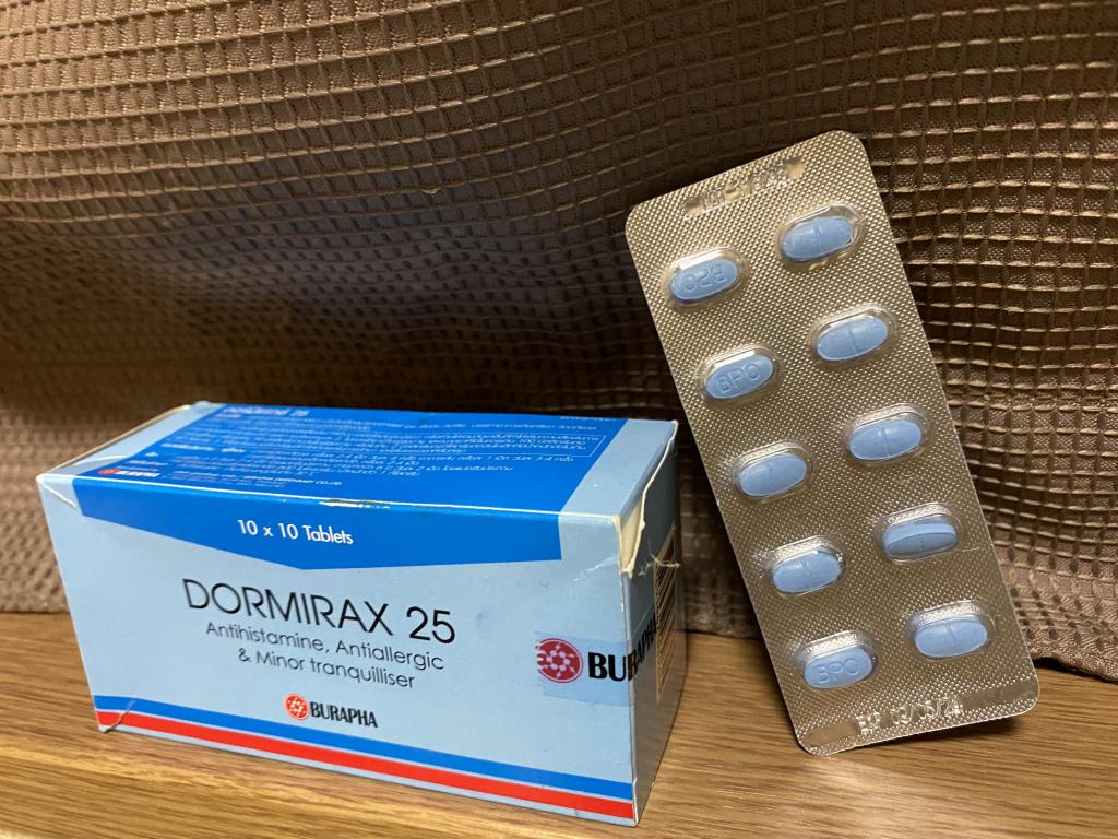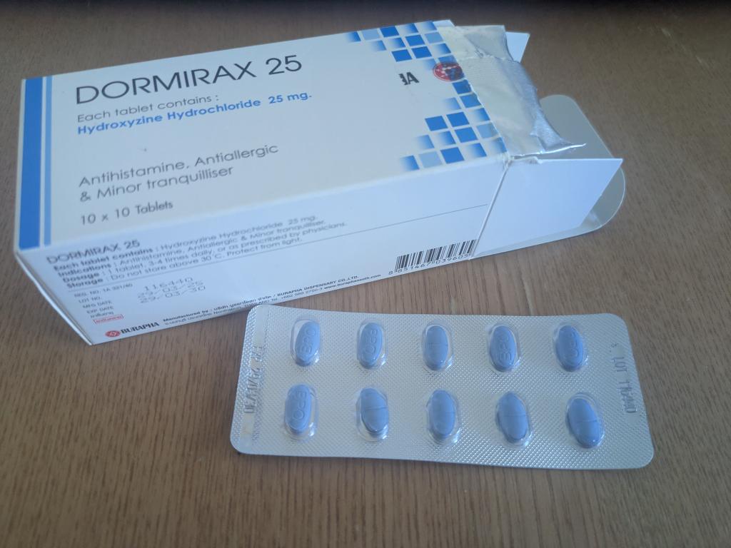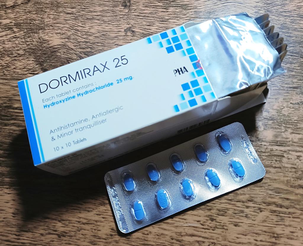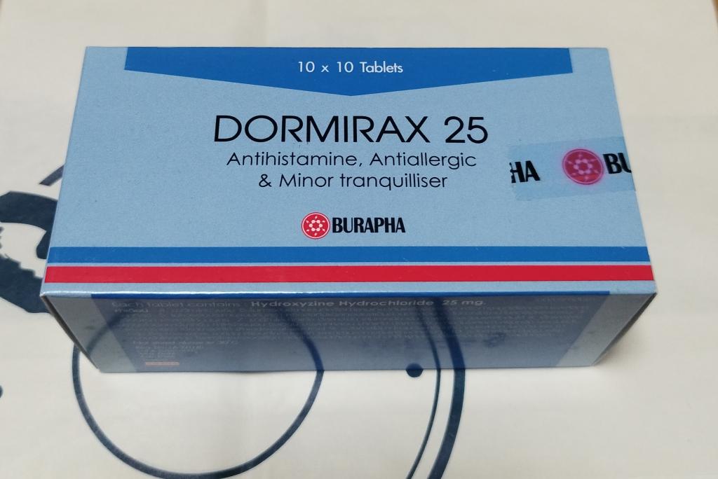 ドーミラックスの成分ヒドロキシジンは第一世代抗ヒスタミン薬の一つで、他の第一世代薬と違い抗コリン作用が小さいのが特徴です。抗コリン作用は口渇や眠気、吐き気の不快な副作用がありますが、ヒドロキシジンは比較的そういった副作用が出辛く、第二世代抗ヒスタミン薬と比べて作用が強く即効性もあるので頓服薬として便利なお薬だと思います。