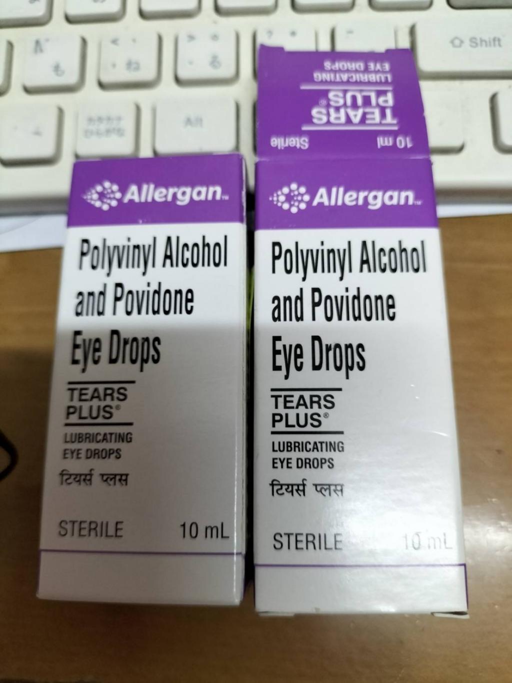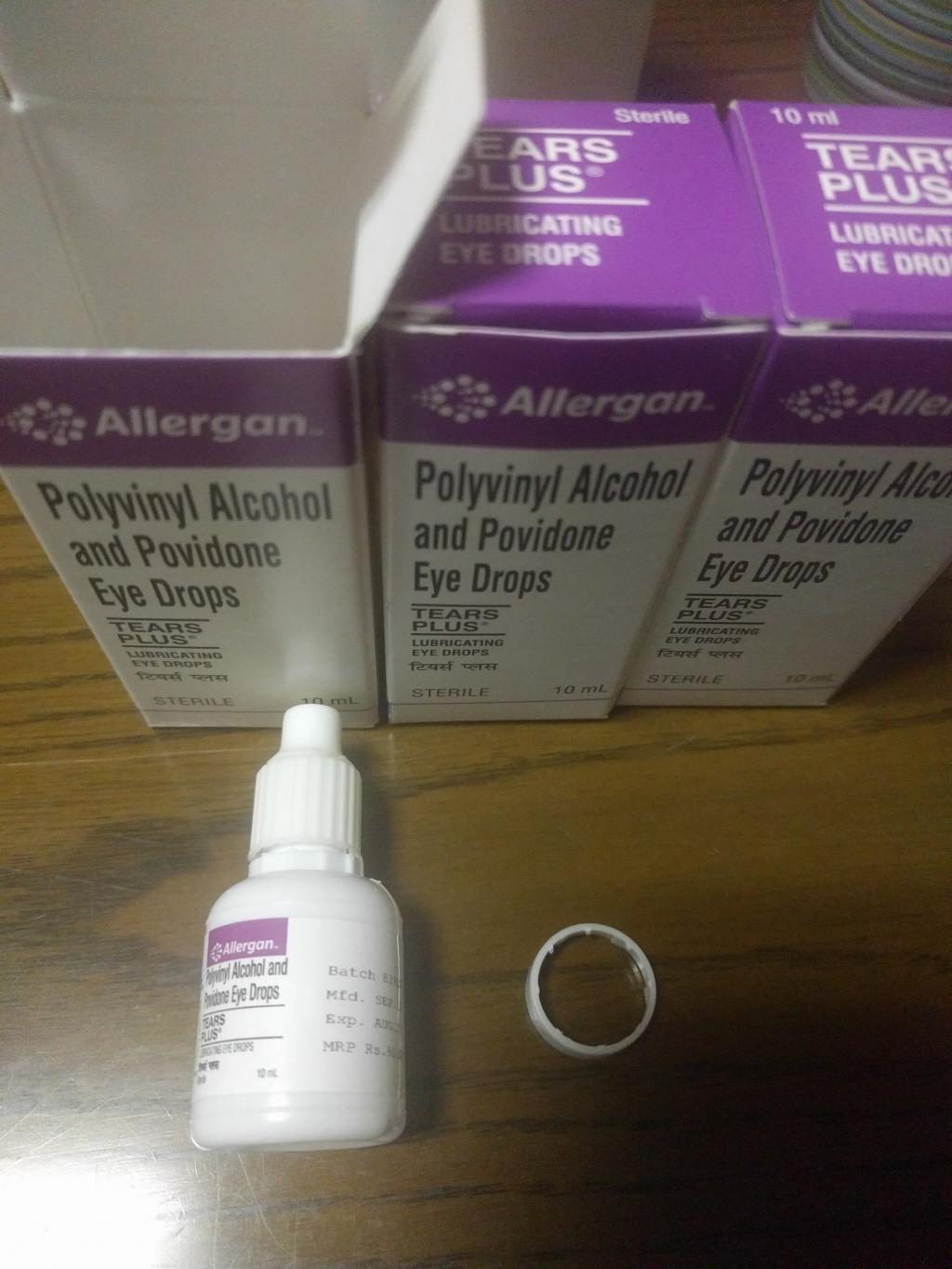 ドライアイがひどく、病院でもらった目薬が無くなったのでこちらを購入しました。コンタクトを外した目には多少しみますが、目のゴロつきは緩和したように思います。日本の目薬と違い丸く、瞬間接着剤のように穴を開けて使用するので、眼球に近過ぎると危ないと思います