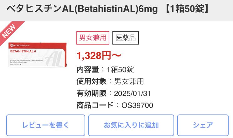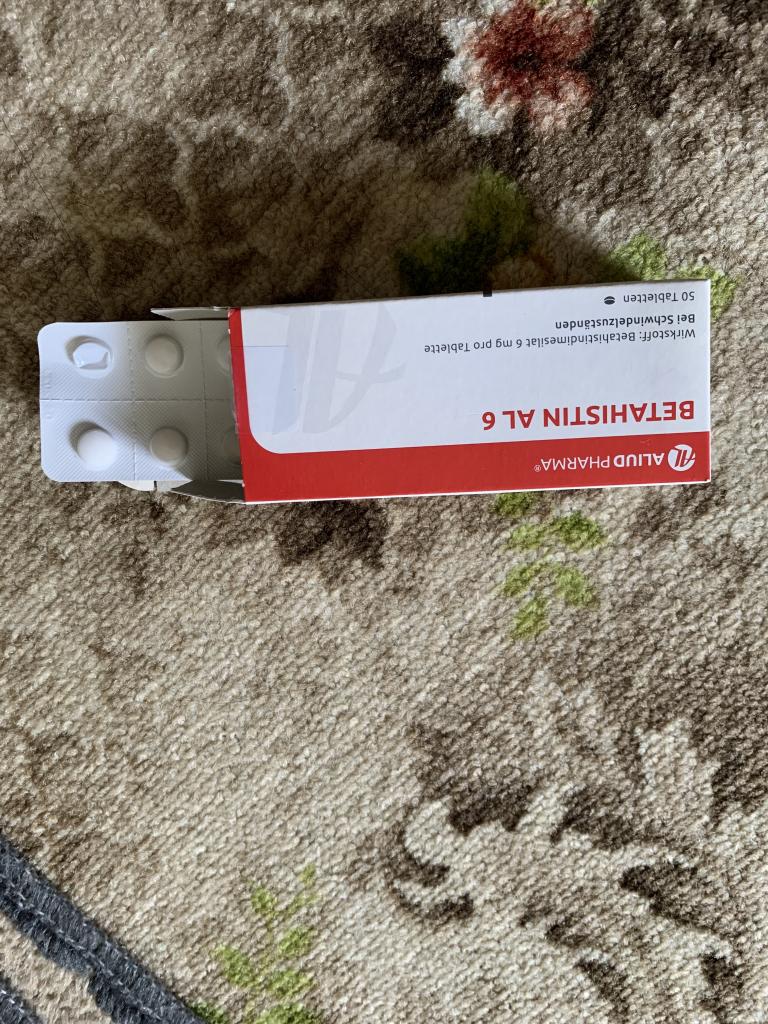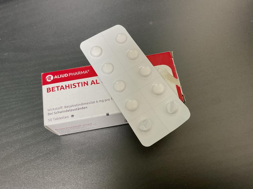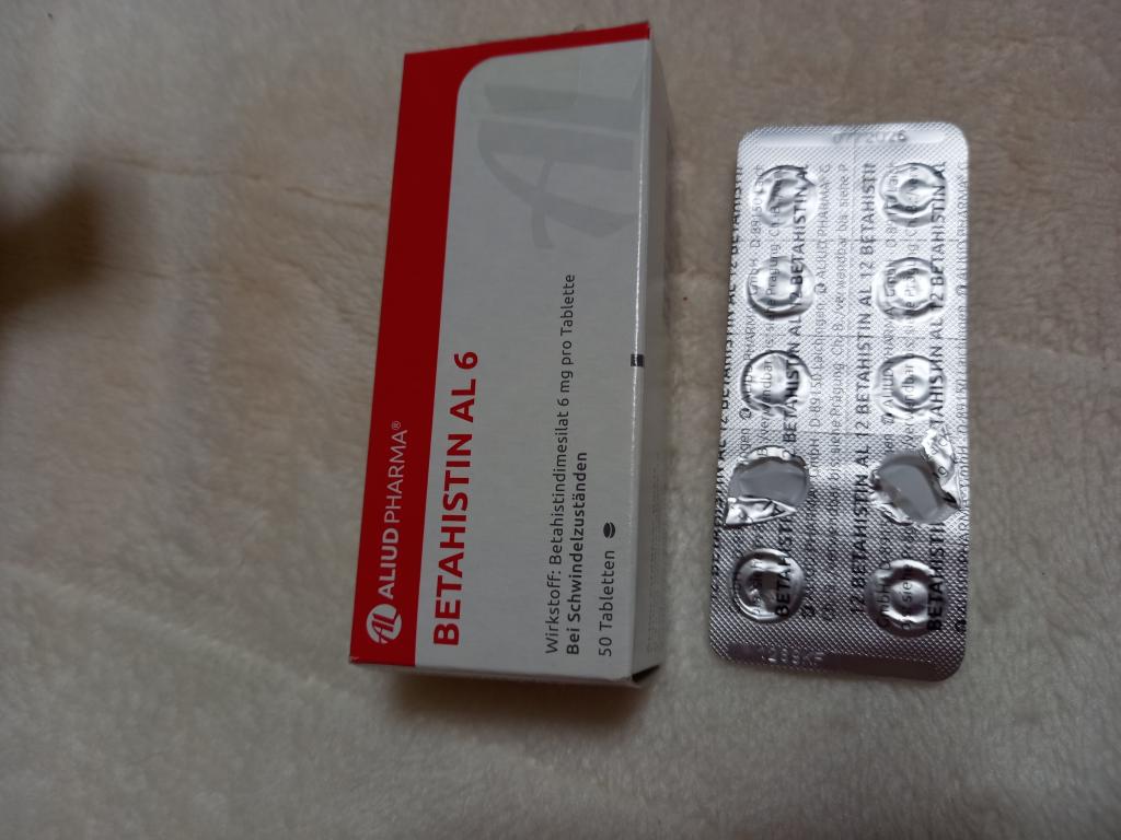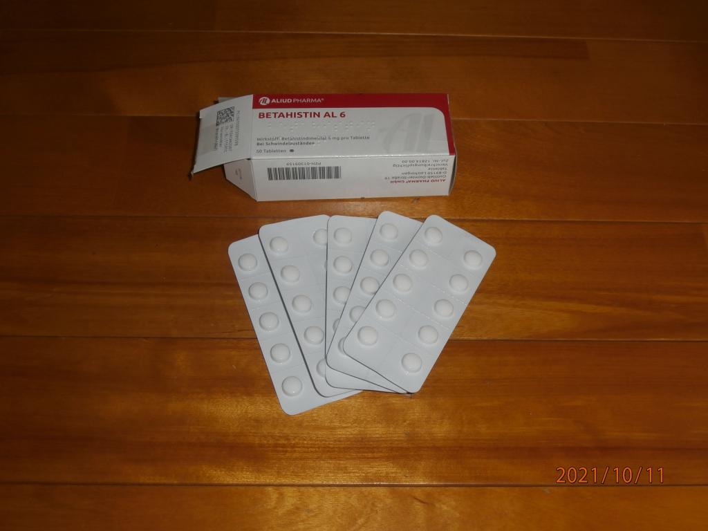 以前、回転めまいが起きた時に耳鼻科で処方されたのがベタヒスチンメシル酸塩錠でした。非常に良くきいてめまいは治りました。今回季節の変わり目で再び回転めまいが起こり同等品がオオサカ堂さんで入手可能だと分かり、早速に入手しました。ドイツ製で成分も同じですので安心でき、送金から12日で届きました。