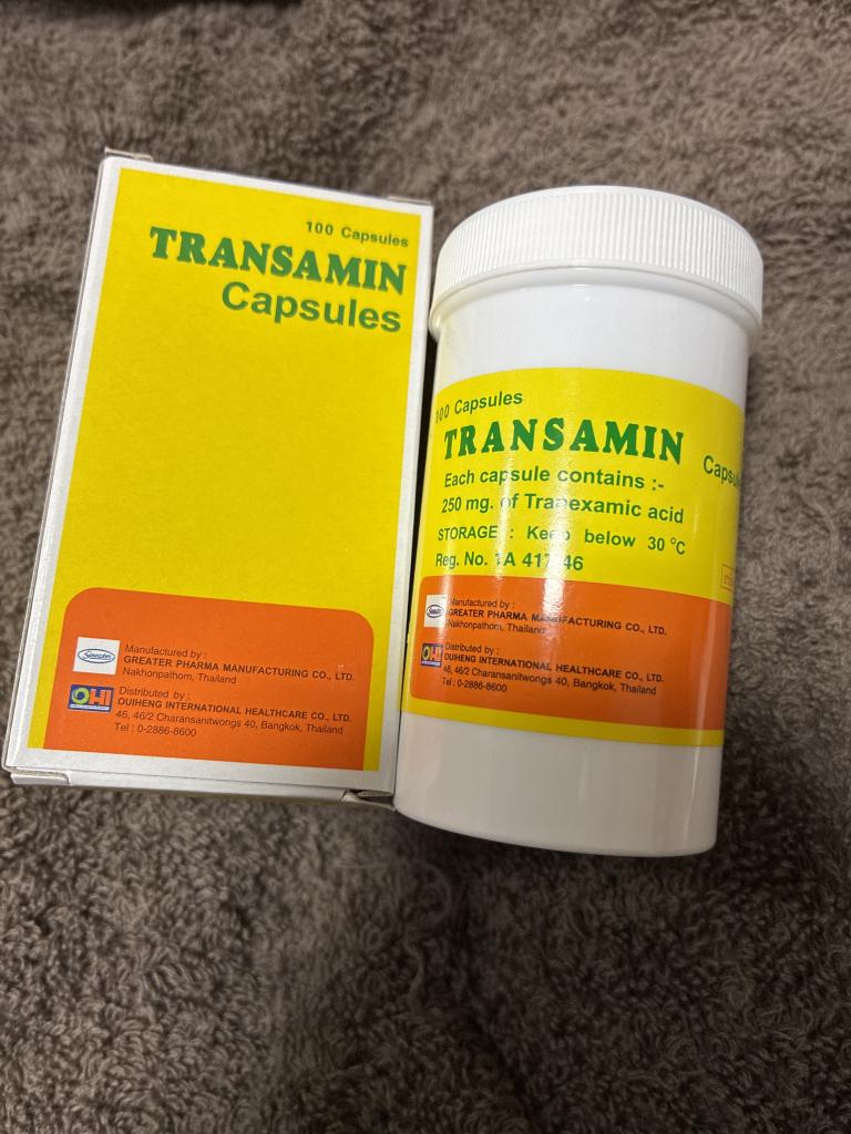 形成外科に擦り傷の跡を残したくないと受診したらビタミンC、Eと一緒に処方されました。傷跡どころか、顔のくすみや、肝斑、痒みで掻きすぎて色素沈着していた足まで綺麗になってきて驚いたのですが、通院が面倒で処方が終わったあとはビタミンだけ市販の薬を飲んでいると徐々に戻ってきていました。市販では肝斑用のものは高額でどうしようかと思っていたら購入できて良かったです!!カプセルの色は処方薬と同じでした。