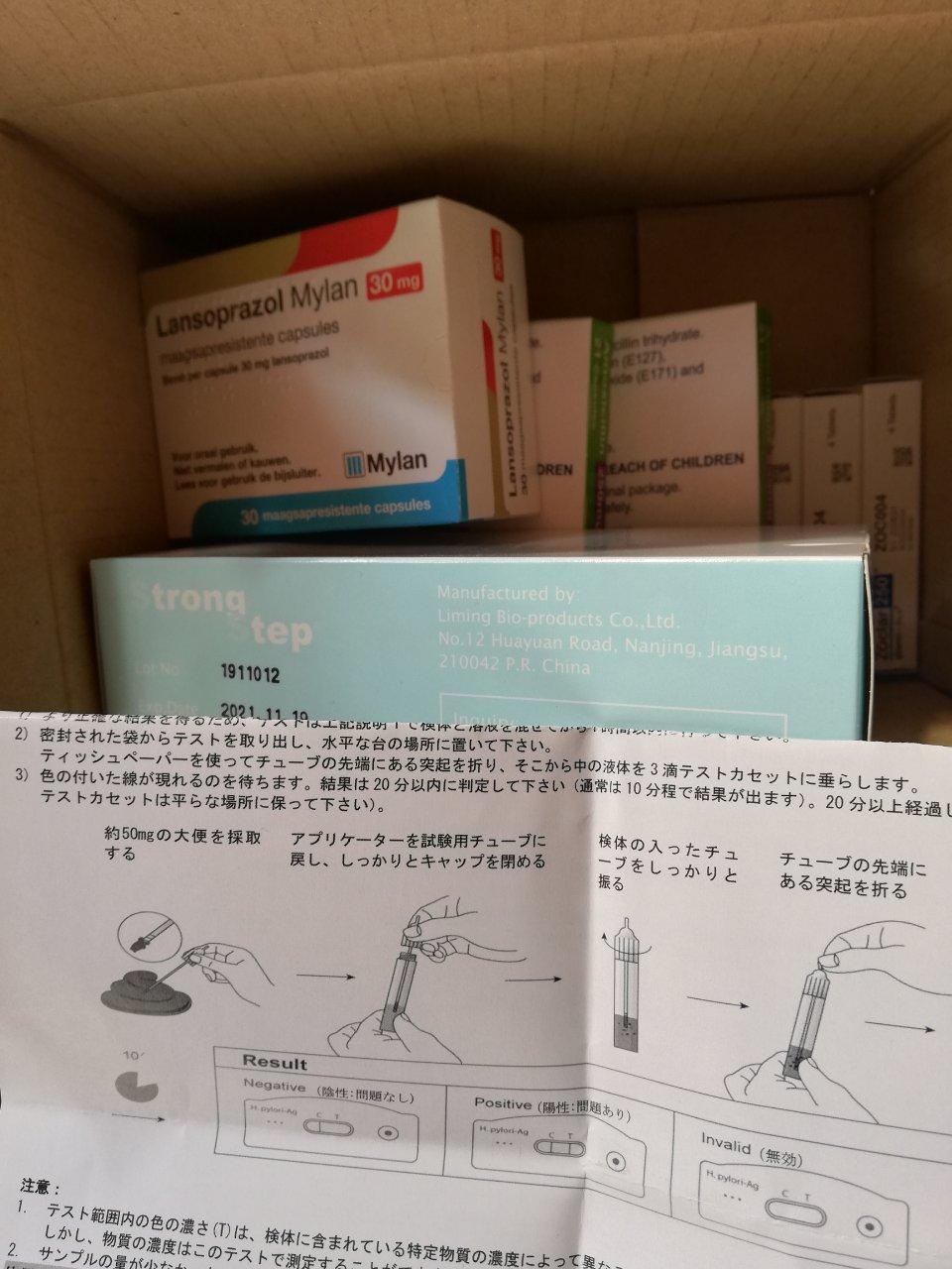 検査方法は日本語説明あり。陽性の場合の抗生剤等の服用は何も書かれていないがネットで検索すればすぐにわかると思います。胃薬(赤白)1P 、アモキシシリン(グリーン)3P 、カリシン(黄色)1Tが一回分でこれらを1日2回服用です。わたしは陰性でしたので今回は使用しませんでしたが、薬はオメプラゾール、クラリス等のジェネリックですので感染症の時のためにおいておきます。当方製薬メーカーに長年勤務してますので知識がありますが、服用等心配の方はとりあえず検査だけのものもあります。非常に簡便です。