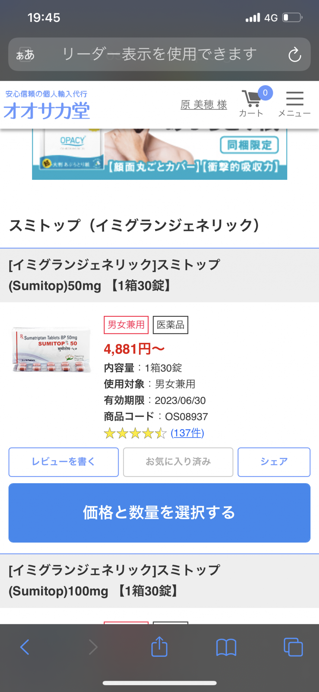 イミグラン系ではこれが一番コスパがいいです。常備薬としは最適。ただ100mgと最近迷い始めました。。