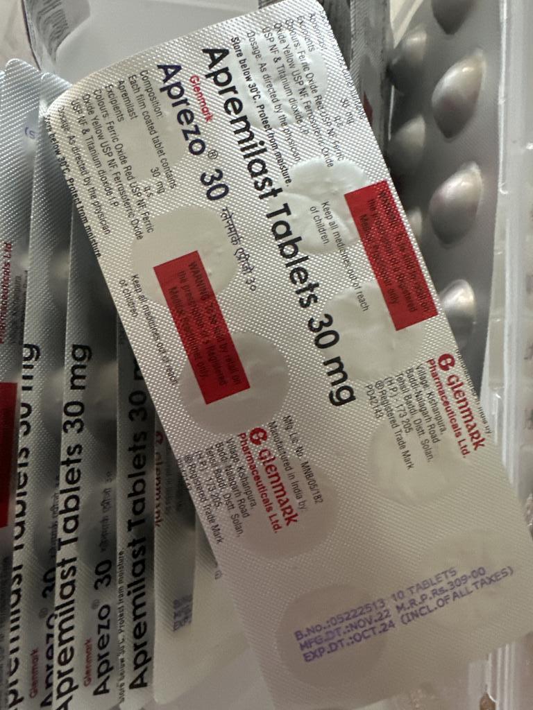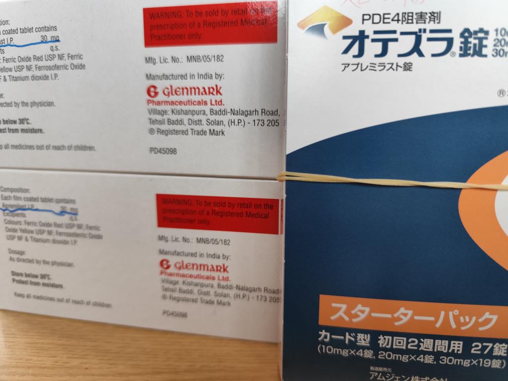 皆さんが書き込まれて居るように、国内のオテズラ錠30mg処方薬は、非常に高価ですが治療に対しては有効で継続的なお薬ですが、なにせ高額となりますので継続服用には頭痛の原因となります事から医師に相談しましたが、国内のジェネリック薬は有りませんとのことでしたのですが、こちらのオオサカ堂さんで海外のジェネリック薬として個人での購入が可能で有ることを知り、即座に注文させて頂きました。オオサカ堂さんでの購入額で有るなら(それでも長期間になれば負担は大きいですが、医療薬局よりは遥かに負担軽減になりますので)このまま服用が続けられるとすがりました。リピートしたいと思います。有り難うございました。