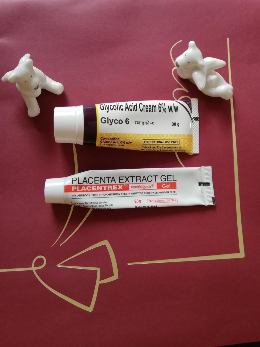 洗顔<-ヒトプラセンタジェル(10分放置)<-化粧水、ビタミンC美容液<-グライコ<-ハイドロキノン