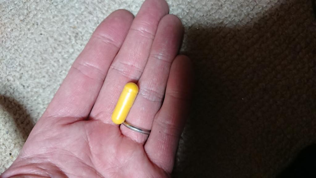黄色い大きめのカプセルです。私自身は問題なく飲めますが、若干の見にくいと思われる方もいるかもしれません。ほかの方も書かれたいたかと思いますが、300ミリと容量が多くて、良いと思います。