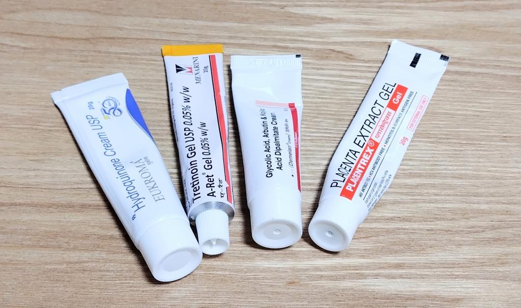 トレチノイン0.05を塗ってから、ハイドロキノンを上に重ねる方法で、3日目に薄皮ですが剥けてきました。