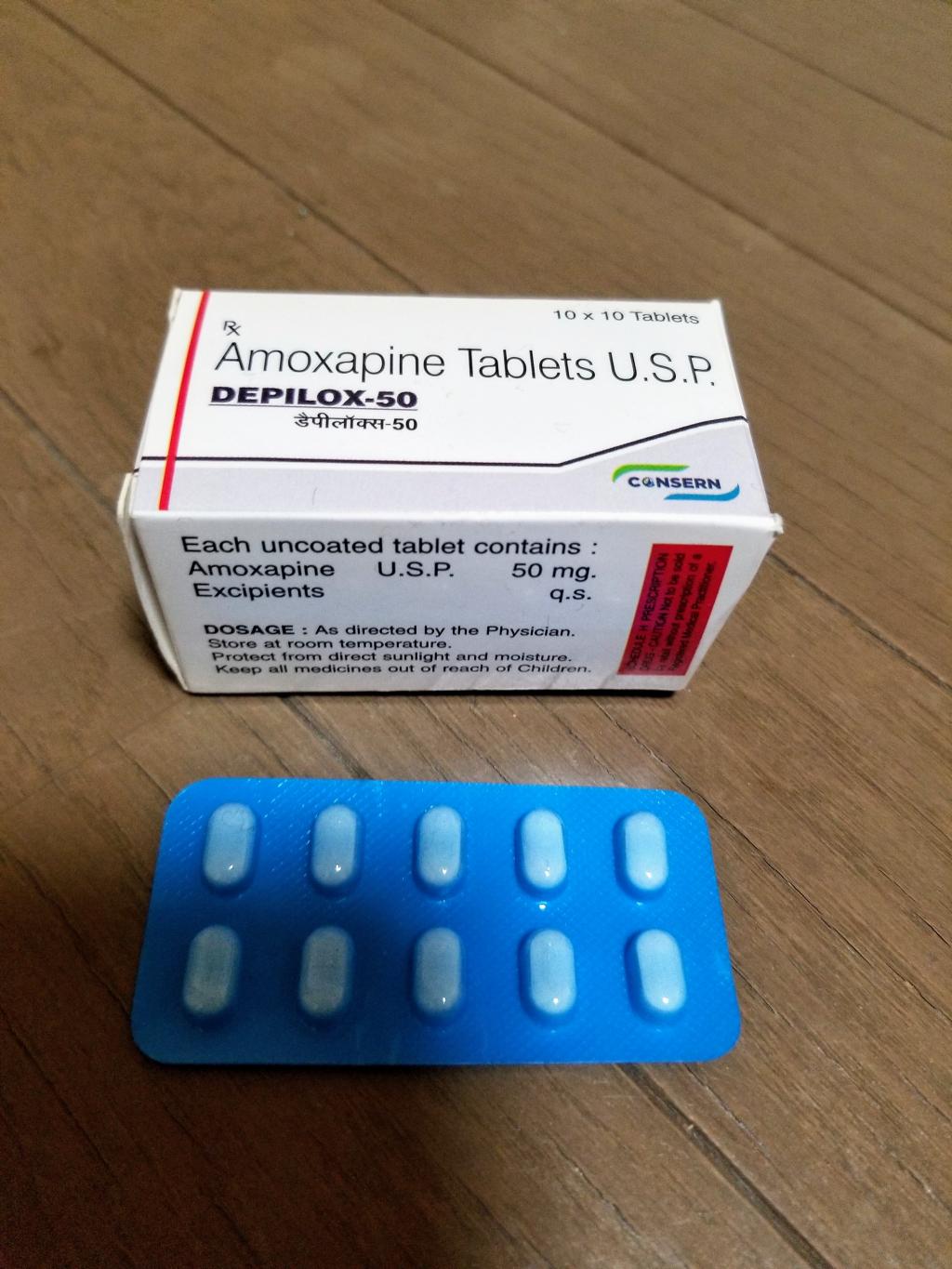 アモキサンを医師から処方されてから、いくらか気力が出てきた薬。もしもの控えとして買っておきました。若干便が硬くなるので、便秘の方は控えた方が良いかもしれません。50mgですが半分に割れるので、25mg単位での調整が可能です。