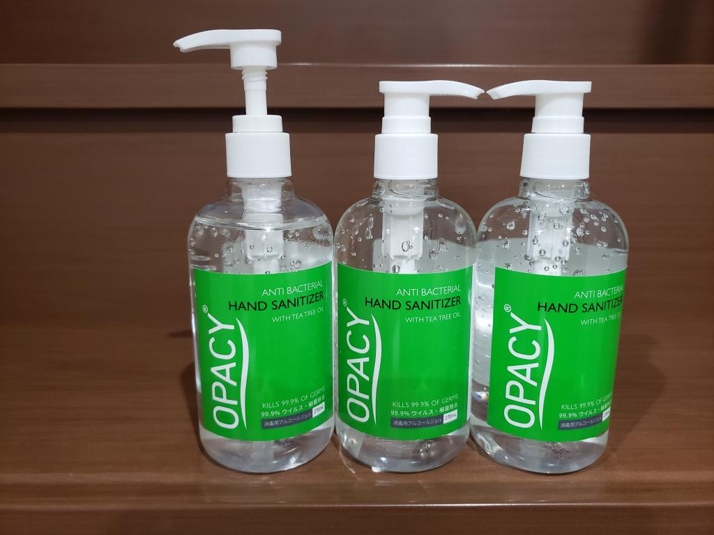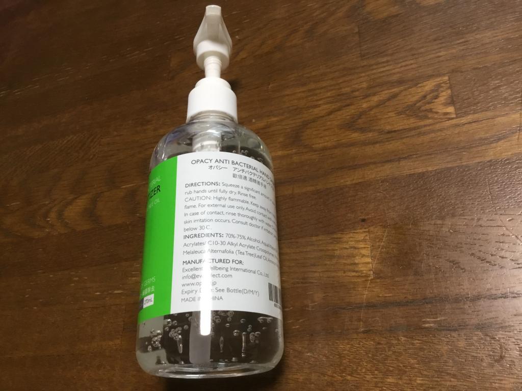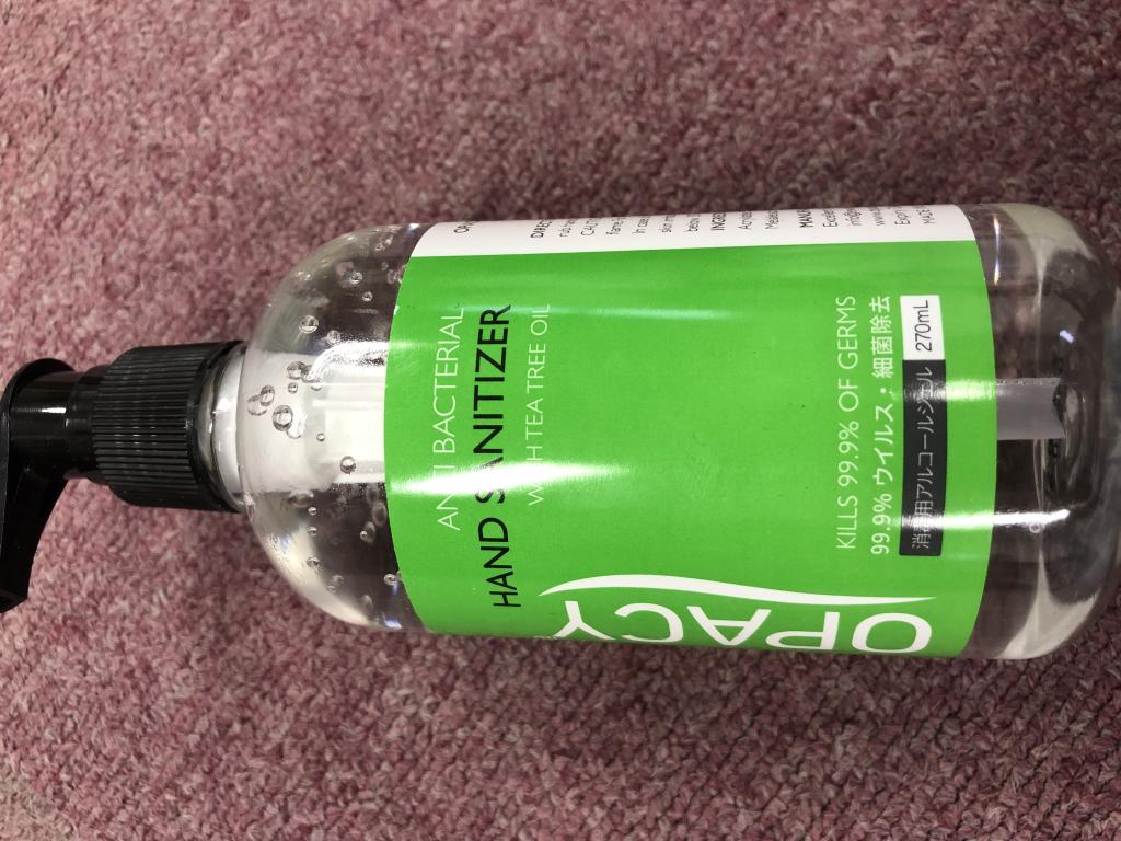 スーパー入口に置いてあるアルコール濃度の低いジェルは、しばらく手に残りますが、こちらのジェルはすぐに蒸発します。濃度が高い証拠だと思います。