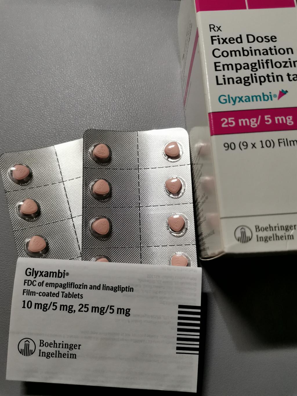 自己責任でダイエット目的として購入しました。グリクサンビ25mg/5mgを朝食後に1錠、メトホルミン500mgを昼食後と夕食後に1錠ずつ。これらを飲み始めて10日で1.6kg減量しています。特にこれといった運動はせず、毎日普通に食べているのにこの効果は凄いと思います。グリクサンビの副作用としては、少し尿の回数が増えたくらいです。これからも効果に期待しています。