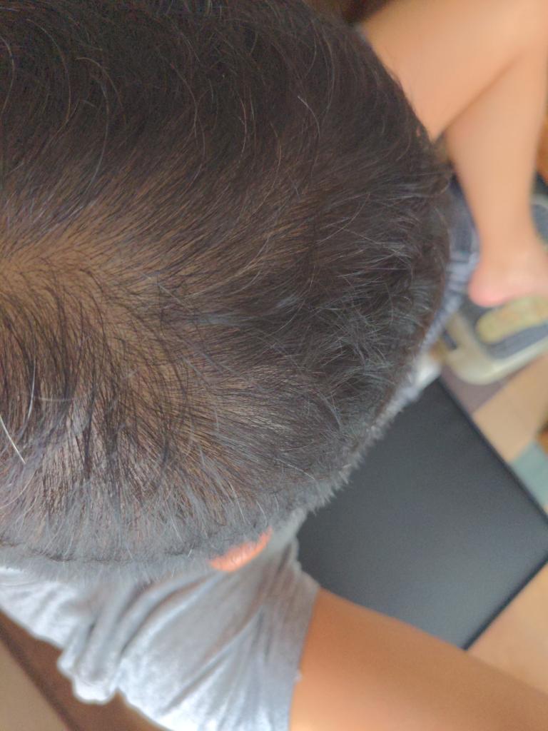 3か月くらい経ったころに頭頂部を触ったら毛髪全体にコシを感じ、試しに写真を撮ってみたところ短い産毛のような発毛を確認できました。