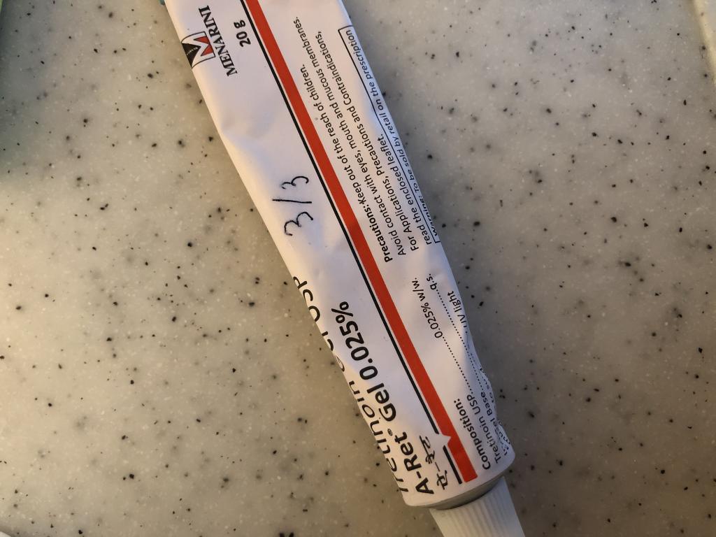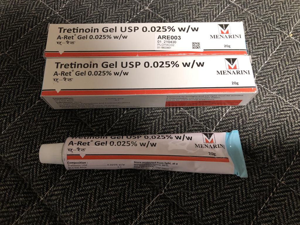 トレチノイン療法を2回行いました。今は良い感じをキープするため月1回数日のみトレチノインを塗ってメンテナンスをしています。この濃度だと数日くらいでは少し顔がぴりつく程度で大丈夫なのでよいです。さらに数日後くらいで部分的に薄く皮がむけます。酸化が心配なのでちいさなジッパーの小袋に少量づつ分割し冷凍して使っています。個人的には効果は変わらないように思いますが自己責任です。