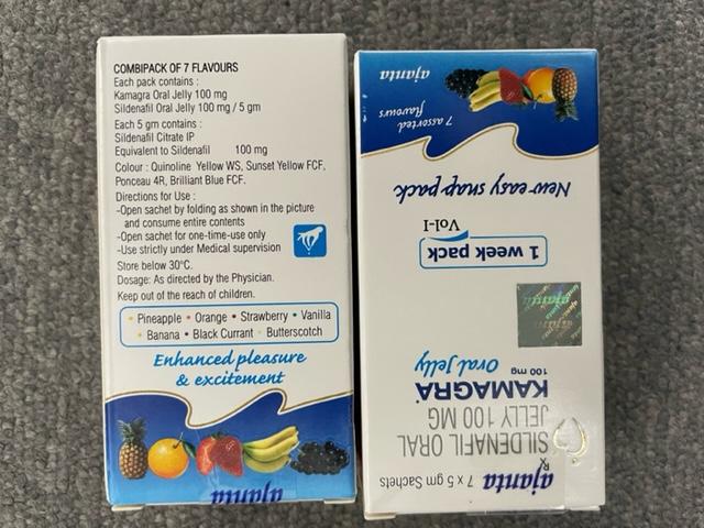 いつもは錠剤のカマグラを飲用してますが、今回初めてオーラルジェリーを購入しました。成分も100mgとあって効果も全く同じでした。違いは携帯性と水なしでどこでも口にすることができることですかね。あと、味の方はアメリカのグミみたいな感じです。