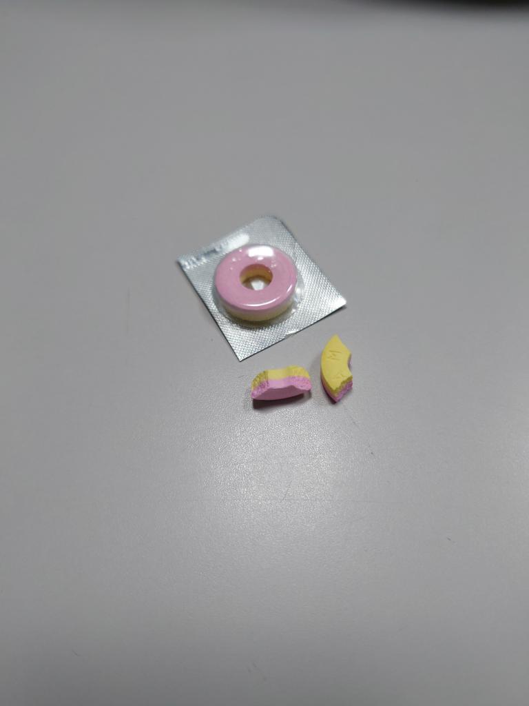 甘い味でラムネより簡単に噛み砕けます。口の中で粉々になりますが、やはり口をゆすぐため水で流しました。