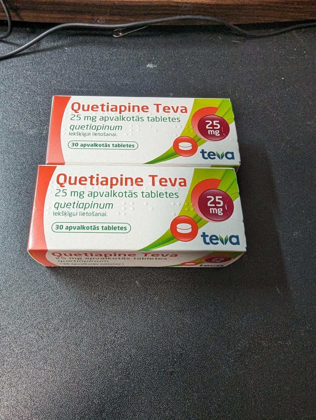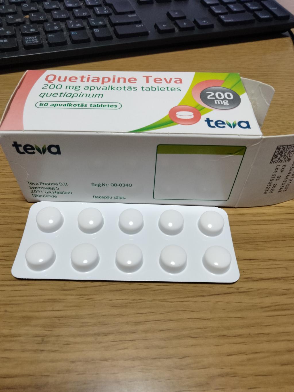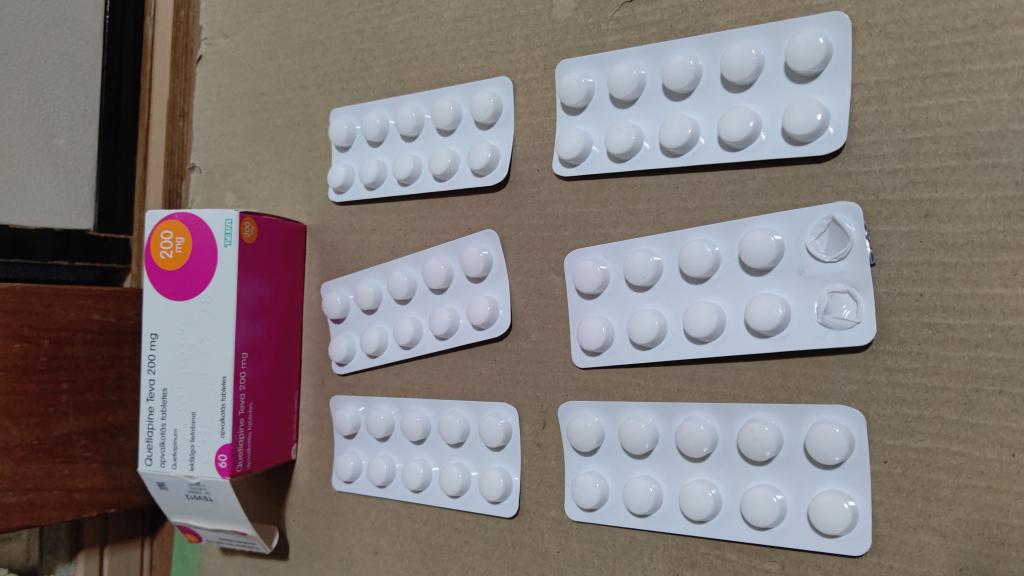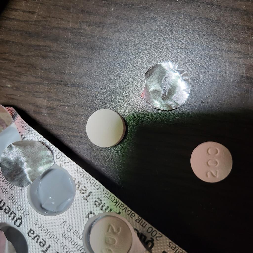 クエチアピンがなくなって本日約2週間ぶりにクエチアピンが到着しました。服用を中断している間離脱症状が酷く動悸、不安、発汗、脱力感がとてもたまりませんでした。クエチアピンは基本的飲んで6時間しか効かないので朝、昼、晩で飲むのが正しい使い方です。急激にやめるのは注意が必要ですので服用されている方は気を付けた方がいいと思います。クエチアピンは睡眠の質を高め精神的に安定しますのでわたしはおすすめです。でも初めて飲む方には200ミリはかなり多いです。