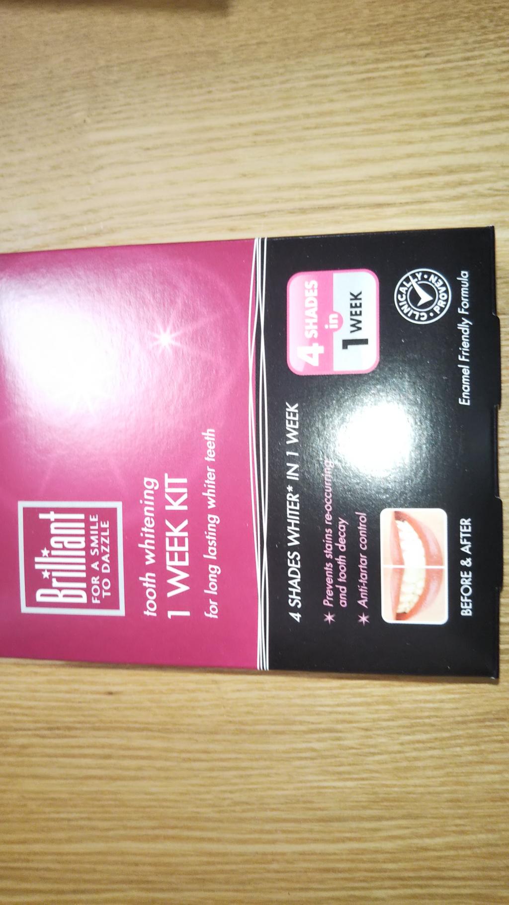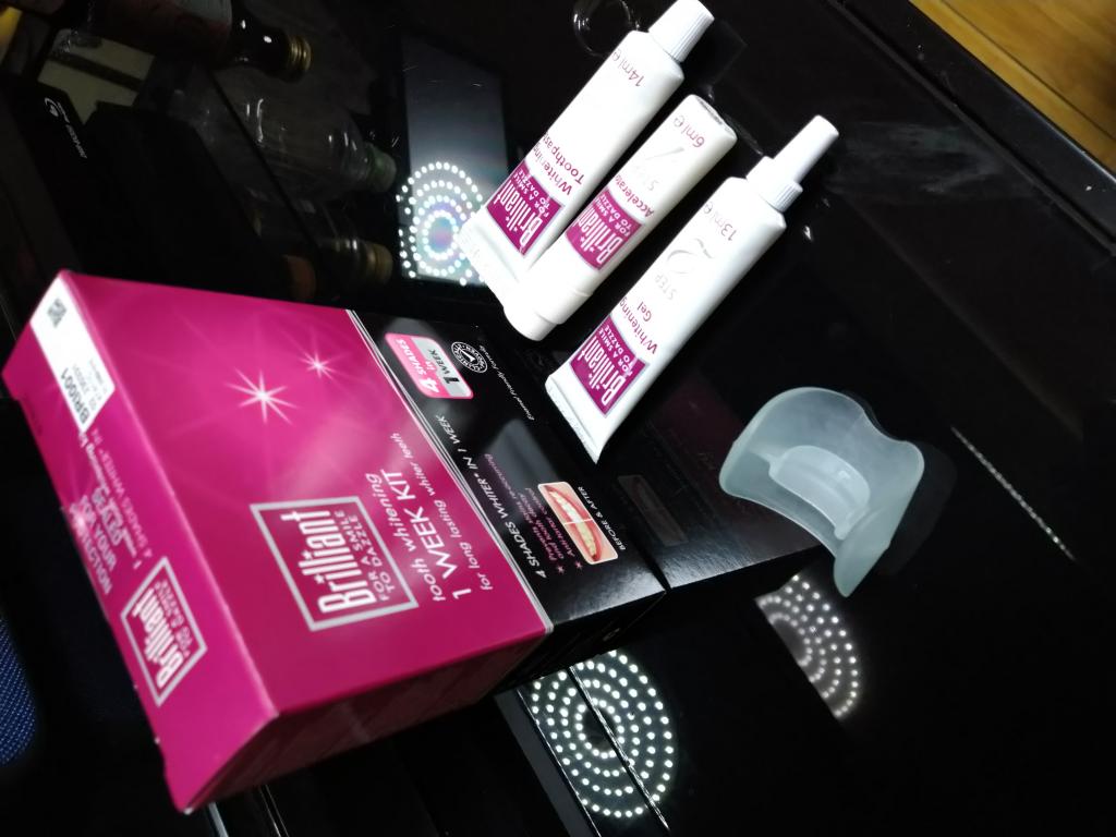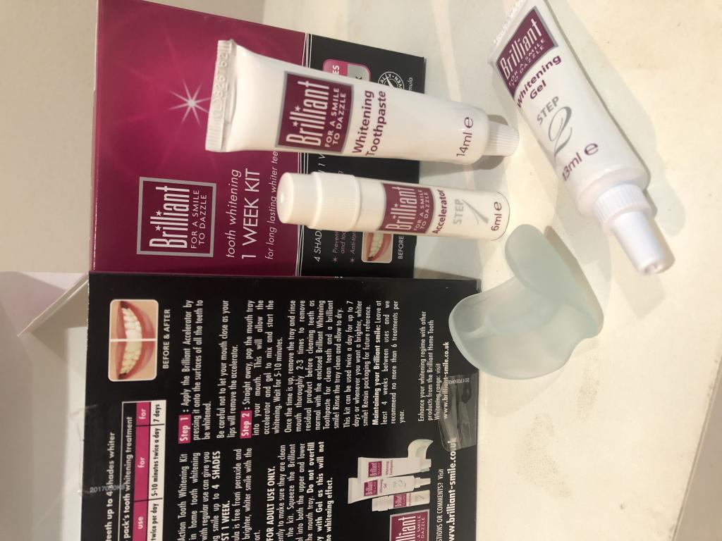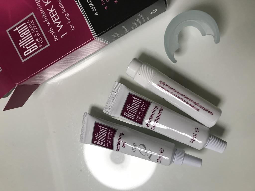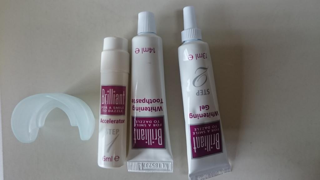 注文してから10日で届きました。以前、ホワイトニングで歯医者に通っていたのですが、ホームホワイトニングジェルが歯や歯茎に沁みる事がありましたが、このブリリアントトゥースのジェルは沁みませんでした。歯磨き粉が付いてましたが、まるで歯医者の香りがして高揚しました。ちなみに歯医者の歯磨剤は3000円ほどしますが、なんだか得した気分です。使用後の感想は歯がツルツルになります。付属の簡易マウスピースだとテクがいるので、私は歯医者のマウスピースを使用。1液の量がもう少し増えて欲しいので☆3つで。ワントーンは白くなりましたが、刺激が少ないジェルなので、私には合ってます。