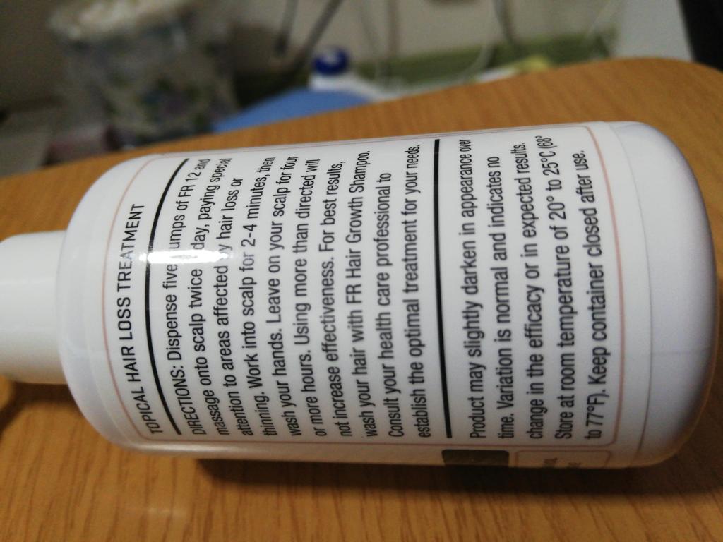 DHT対策としてフィナステリドが、入っているということで、FR12を選びましたが、ミノキシジル12%は、さすがに私の頭皮には濃すぎた。1日2回つけると頭皮があっという間に炎症を起こしてしまう。ちょっとだけつけてもだめです。5%とか7%とかで入っているのが、あればいいなと思います。